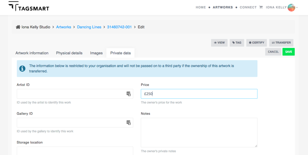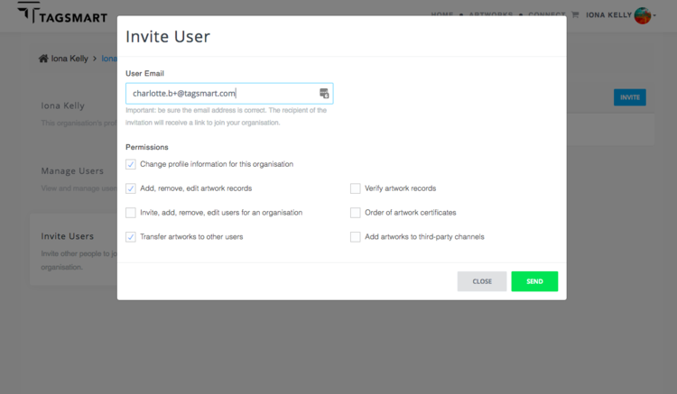Tagsmart accounts can have multiple users which enables you to work effortlessly with other artists, galleries, printers or conservators. You can invite new or existing users to join your account and manage your own invitations from one central login.