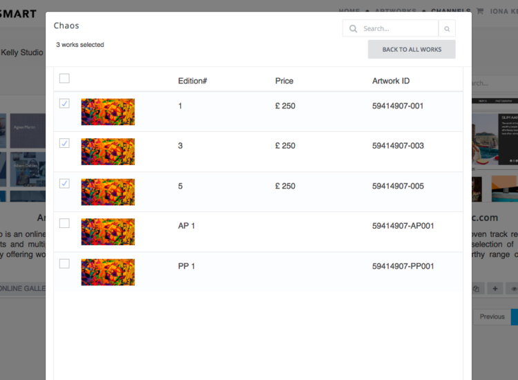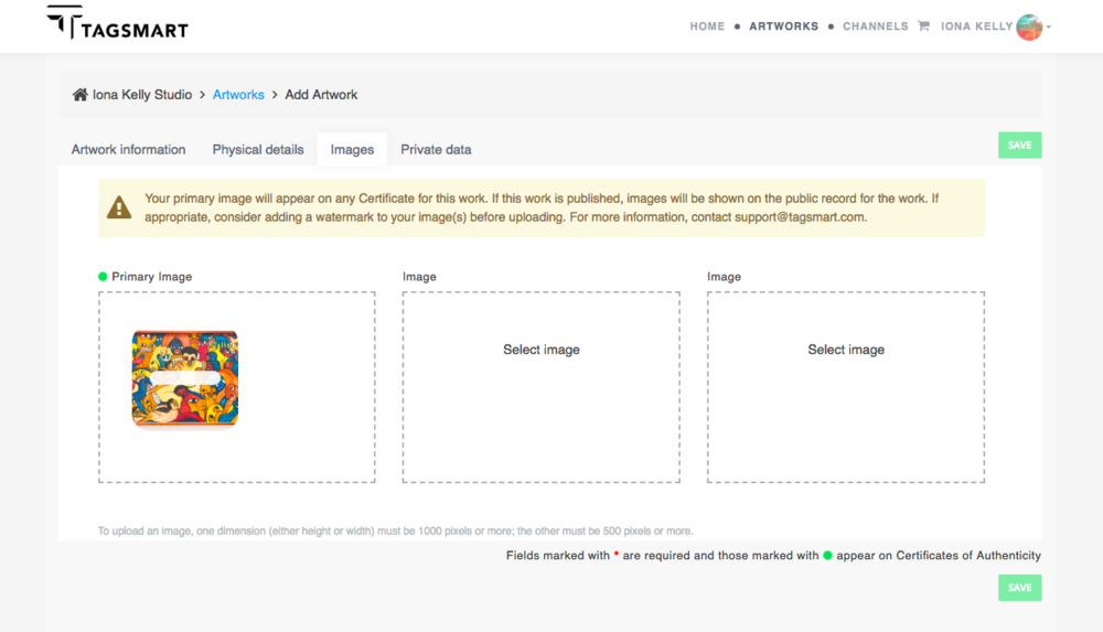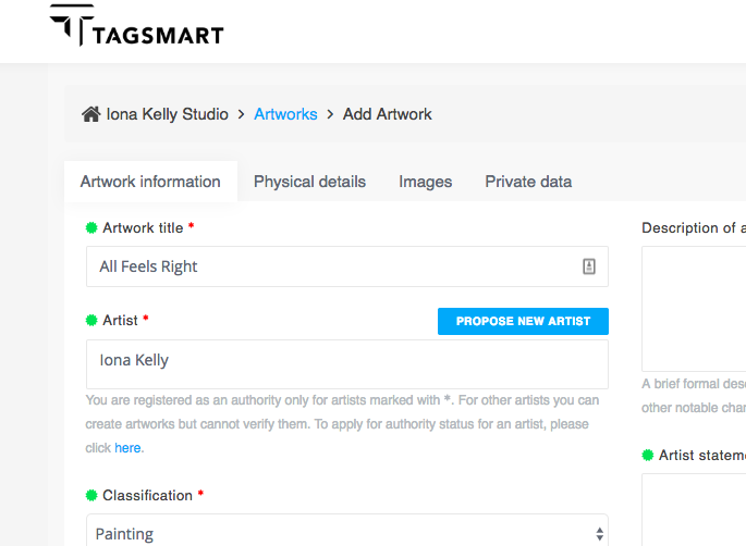 Upload artworks and attribute them to an artist on the Artist Register, which holds information (bio, social media links etc) about Tagsmart artists. At this stage artworks are unverified and can be deleted.