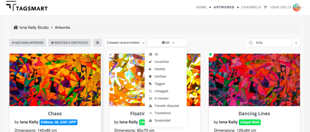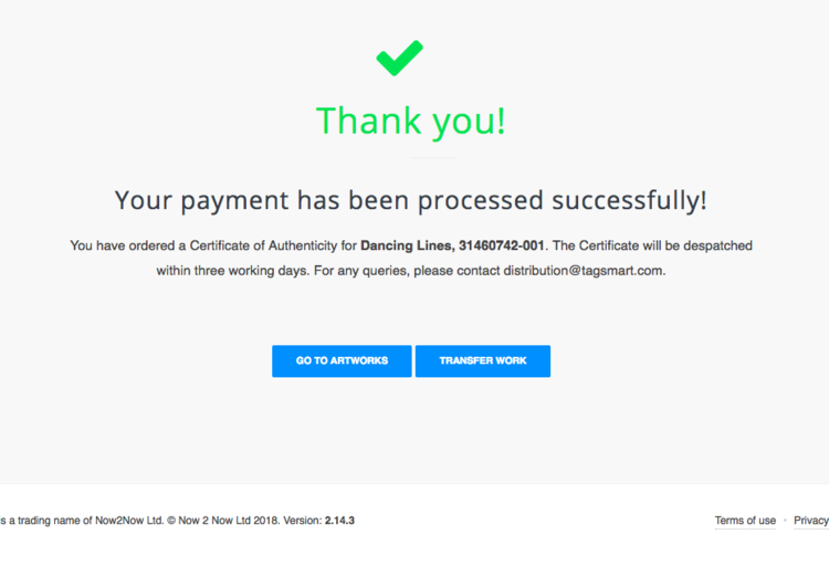 tagged and certified - upon sale the artist must physically tag their artwork and assign the unique tag ID number to the digital artwork record to complete the tagging process (click here to learn how). A Certificate must also be ordered, which can be done directly through the platform (click here to learn how). Provided that the tag ID is assigned, the Certificate will be free of charge.