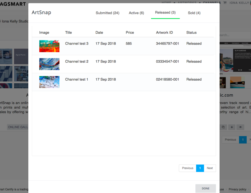 When an artwork is sold, the channel will update the status (see previous section) and the artist will be notified that they need to take action. The artwork must then be: