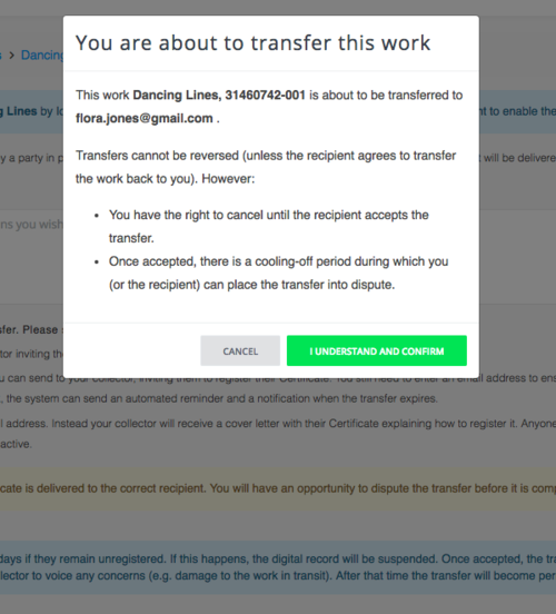 A transfer crucially enables ownership confirmation. Other benefits of completing a transfer include collector access to the artwork record and the ability to easily request a replacement Certificate.